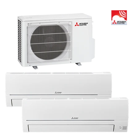 De Mitsubishi Electric WDXH-HA40 VFK is een complete en efficiënte duo multisplit airco met twee stijlvolle MSZ-HR25VFK wand-binnenunits en één krachtige MXZ-2HA40VF buitenunit.
