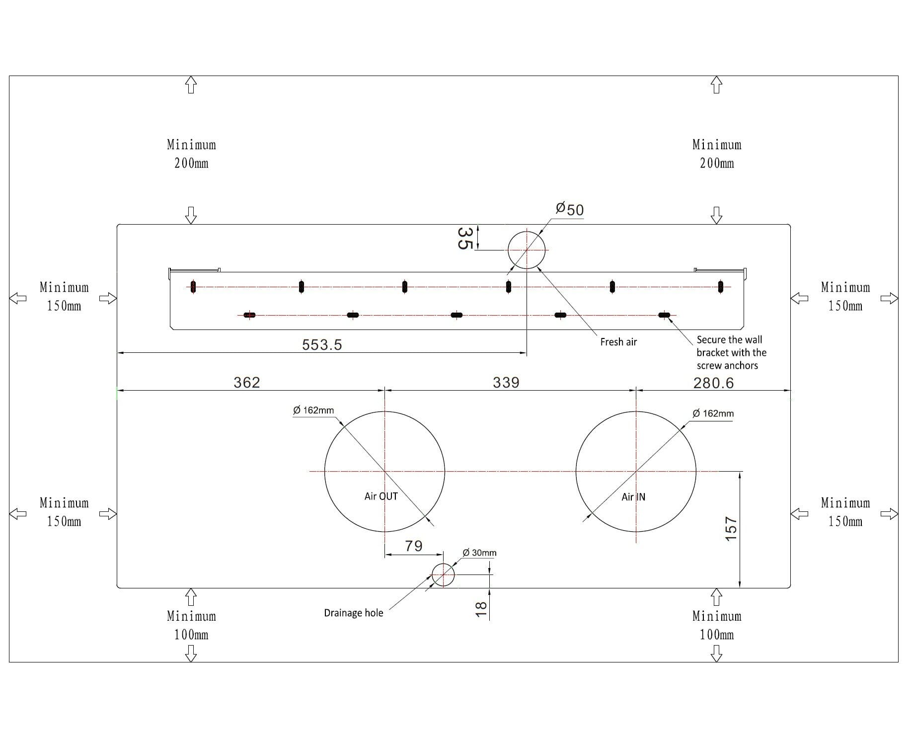 Géén opzichtige airco unit aan de buitenmuur, enkel twee ventilatiegaten (162mm) en een klein gat voor de condenswaterafvoer!