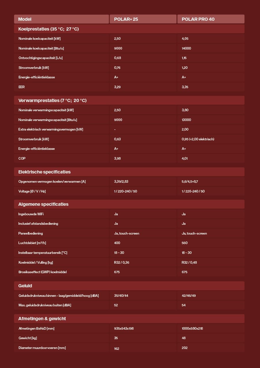De Polar25 airco zonder buitenunit is enkel geschikt als bijverwarming aangezien hij niet meer kan verwarmen met zijn warmtepomp bij een buitentemperatuur lager dan 7°C. Als je een monoblock zoekt die ook geschikt is als hoofdverwarming, Is de POLAR PRO 4,0kW + 2kW elektrische verwarming een betere keuze voor je.